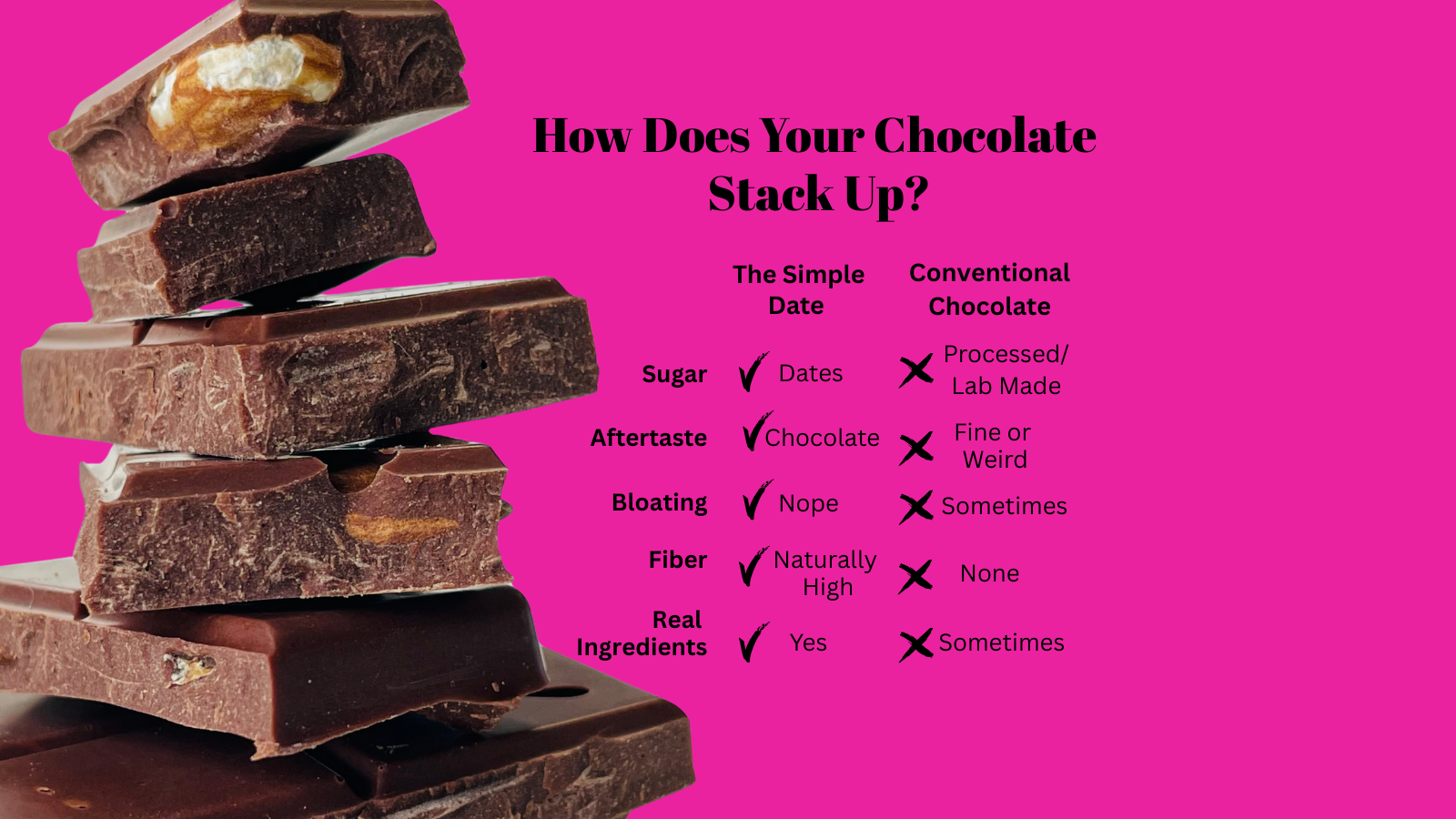 Yes - because it is real chocolate. We use premium cacao and dates to create a smooth, rich flavour without the sugar shock. It's naturally sweet, balanced, and indulgent...just without the "ugh, why did I eat that?" feeling afterward.