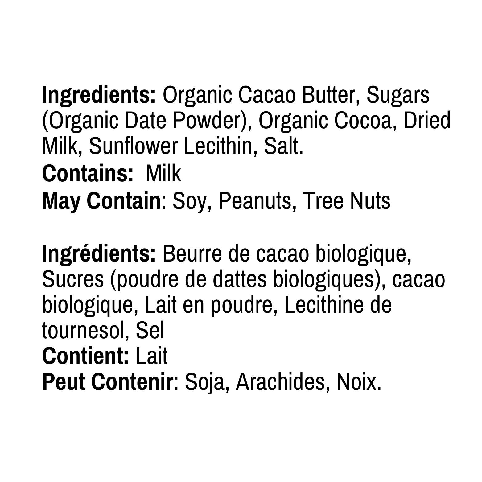 Creamy, smooth, milky - just like the chocolate from your childhood memories, but with a glow up. The Sweet Date is shockingly clean - crafted with whole milk, pure cocoa butter, and dates - never refined sugar or sugar alcohols. Naturally contains minerals like magnesium and potassium for better energy and a calmer finish compared to traditional milk chocolate.